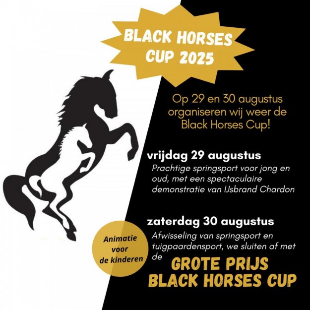 Saturday there is a combination of jumping and harness horses. We close this event with the Grand Prix Black Horses Cup and a guest artist! This day there is also a “children's village” with entertainment for the children (from 10:00 am - 4:00 pm), here they can do crafts and play on the bouncy castle, among other things.